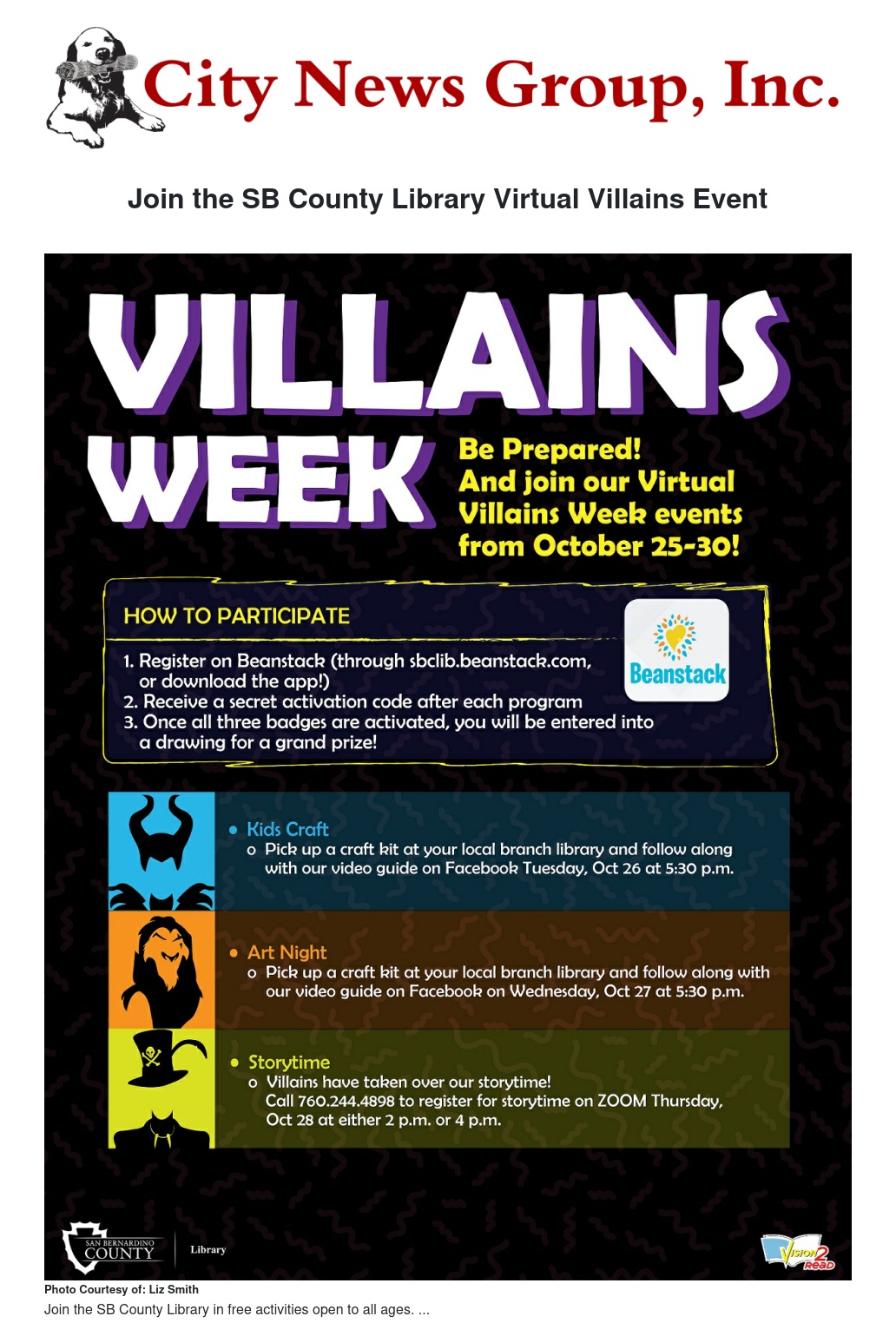 The San Bernardino County Library invites residents to join on Facebook and Zoom for the Villains Event. Enjoy an amazing week of crafts and a special themed storytime with Maleficent and Ursula on Zoom and craft type programs on Facebook.