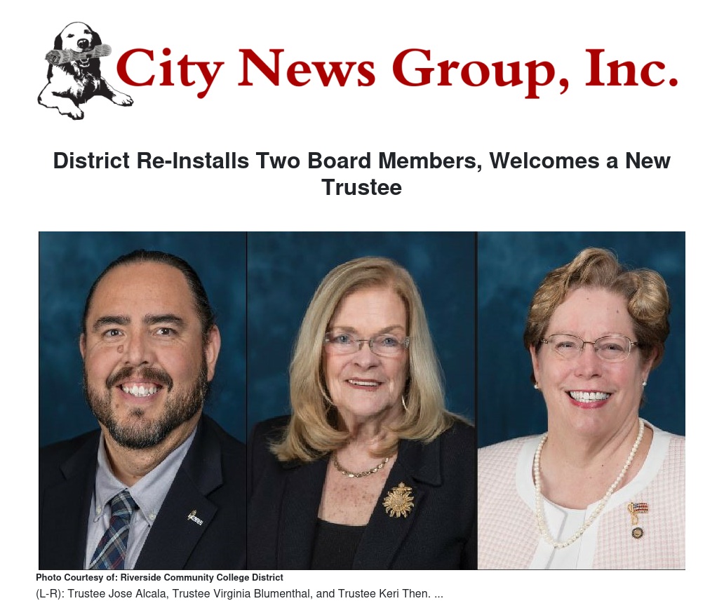 At its December 13 Board of Trustees meeting, Wolde-Ab Isaac, Ph.D., chancellor of Riverside Community College District, swore in Virginia Blumenthal, Jose Alcala and Keri Then as trustees. Trustees Blumenthal and Alcala won re-election after being unopposed in last month’s election. Then defeated former Riverside City College student, Daryl Terrell. Then replaces Tracey Vackar who vacated her Area 5 seat after two terms in office.
