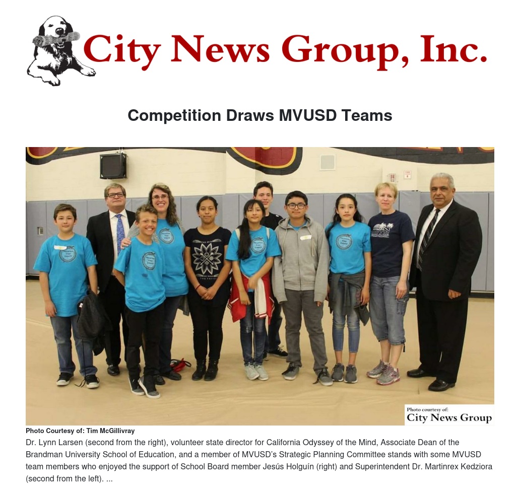 Dr. Lynn Larsen, volunteer state director for California Odyssey of the Mind, Associate Dean of the Brandman University School of Education, and a member of MVUSD’s Strategic Planning Committee attended the event with the MVUSD team members.
