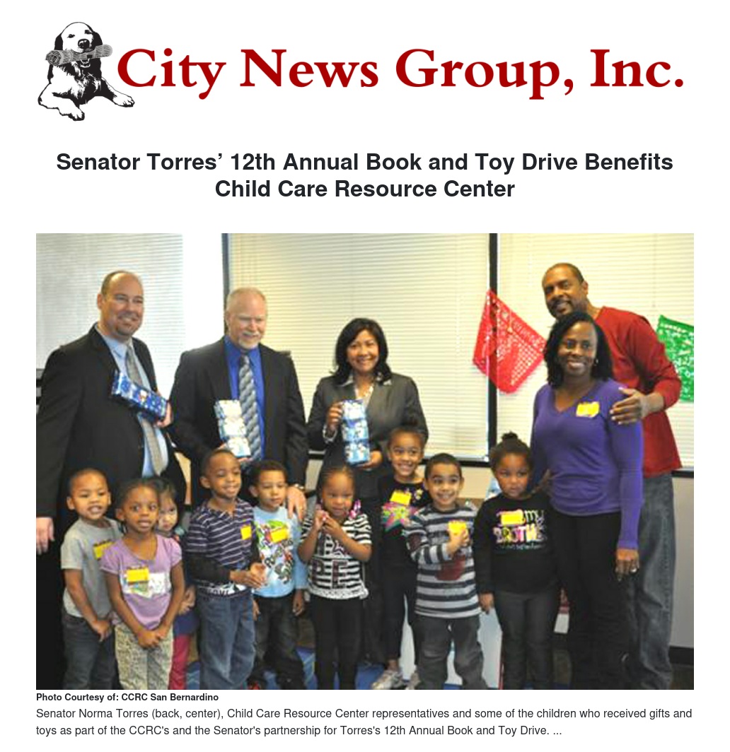 "This year the Child Care Resource Center distributed 10,000 books and toys to children in programs across our service area. We wouldn't be able to do this without valuable community partners who understand the needs of families in their community, like Senator Norma Torres. We are so pleased to be able to partner with Senator Torres this year to make the holiday season a little brighter for children in San Bernardino,” said Donna Sneeringer, CCRC’s Director of Government Relations.