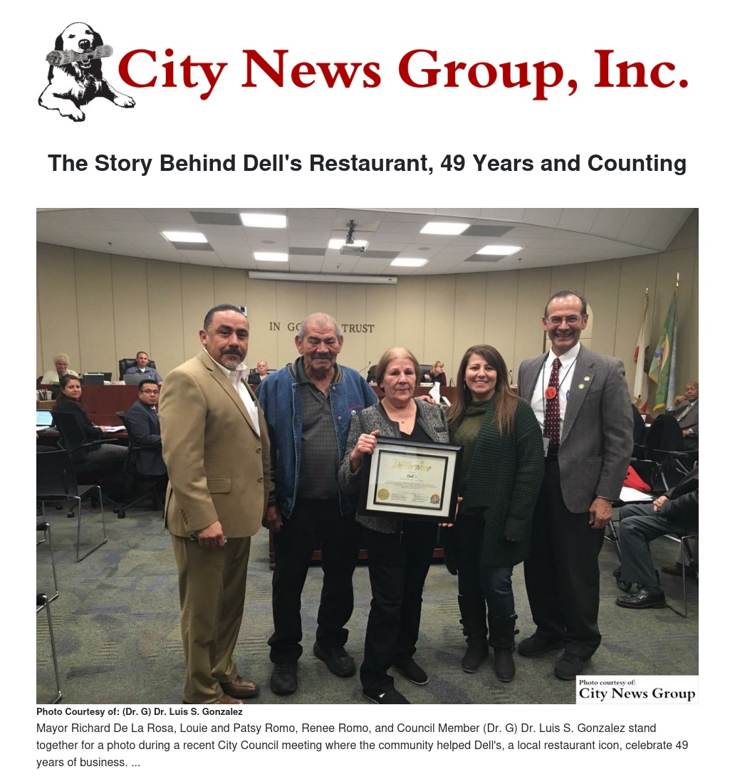 At the recent Colton City Council meeting, Mayor Richard De La Rosa and Council Member Dr. Luis S Gonzalez (Dr. G) presented Dell’s with a “business focus” recognition award for 49 years of business in the city of Colton.