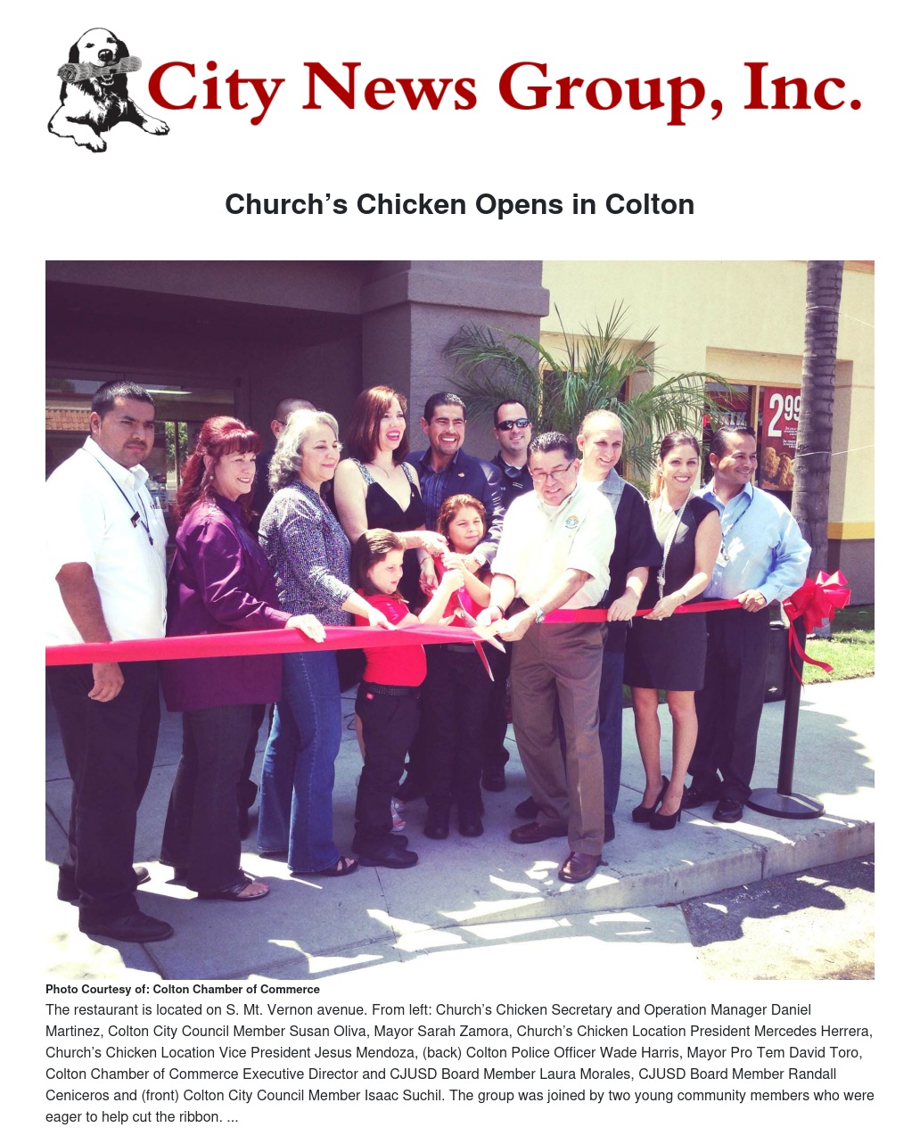 The restaurant on S. Mt. Vernon held a celebration in honor of their grand opening. Restaurant owners were joined by Colton Chamber of Commerce members and Colton City Council members, along with Church’s Chicken Location President Mercedes J. Herrera, D.D.S., Location Vice President Jesus Mendoza, Engineer and International Partner Jesus G. Ortiz and Secretary and Operation Manger Daniel Martinez.