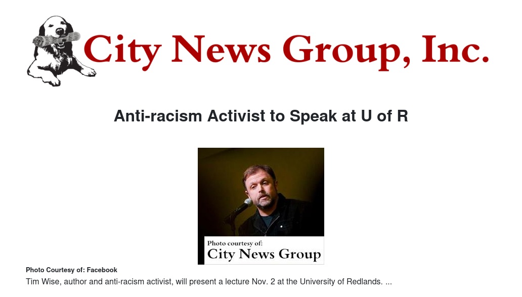 REDLANDS>> Prominent anti-racism activist Tim Wise will present a talk based on his book, "Culture of Cruelty: How America's Elite Demonize the Poor, Valorize the Rich and Jeopardize the Future" at the University of Redlands on Nov. 2 at 7 p.m. in the Memorial Chapel.