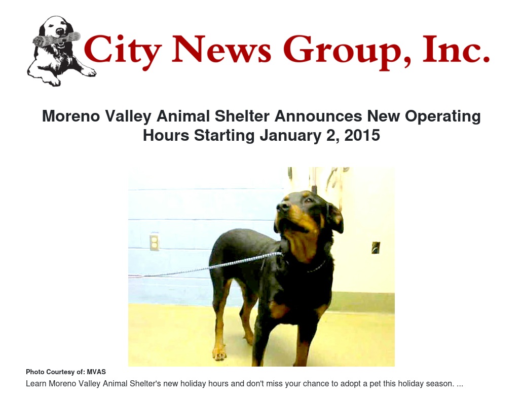 Moreno Valley Animal Shelter Announces New Operating Hours Starting January 2, 2015