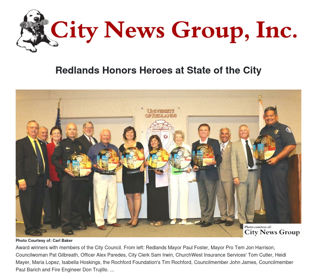 The city paid tribute to the Rochford Foundation and ChurchWest Insurance Services with two beautification awards, while community members Isabella Hoskings, Heidi Mayer and Maria Lopez were named Community Heroes. City Clerk Sam Irwin was also named a Community Hero as a special surprise recipient. Additionally, Redlands Police Officer Alex Paredes and Redlands Fire Engineer Don Trujillo were two city employees recognized whose volunteer activities provide a benefit to the community or individual in a substantial, unique way.