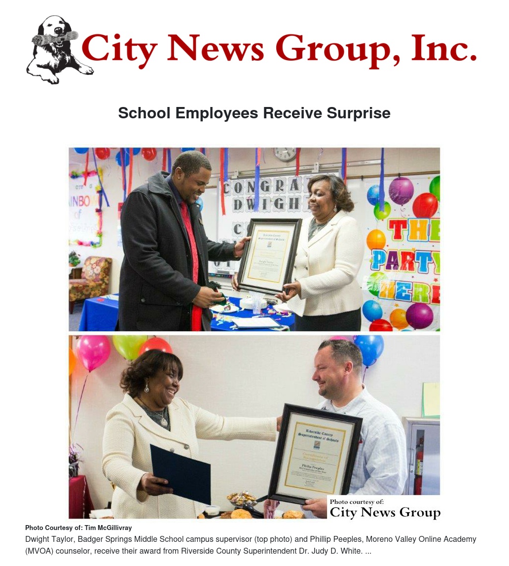 On Wednesday Feb. 24, 2017, of all the staffers who serve the many children who attend the school district of Moreno Valley, Phillip Peeples, Moreno Valley Online Academy (MVOA) counselor, and Dwight Taylor, Badger Springs Middle School campus supervisor, were recognized for their efforts and hard work.