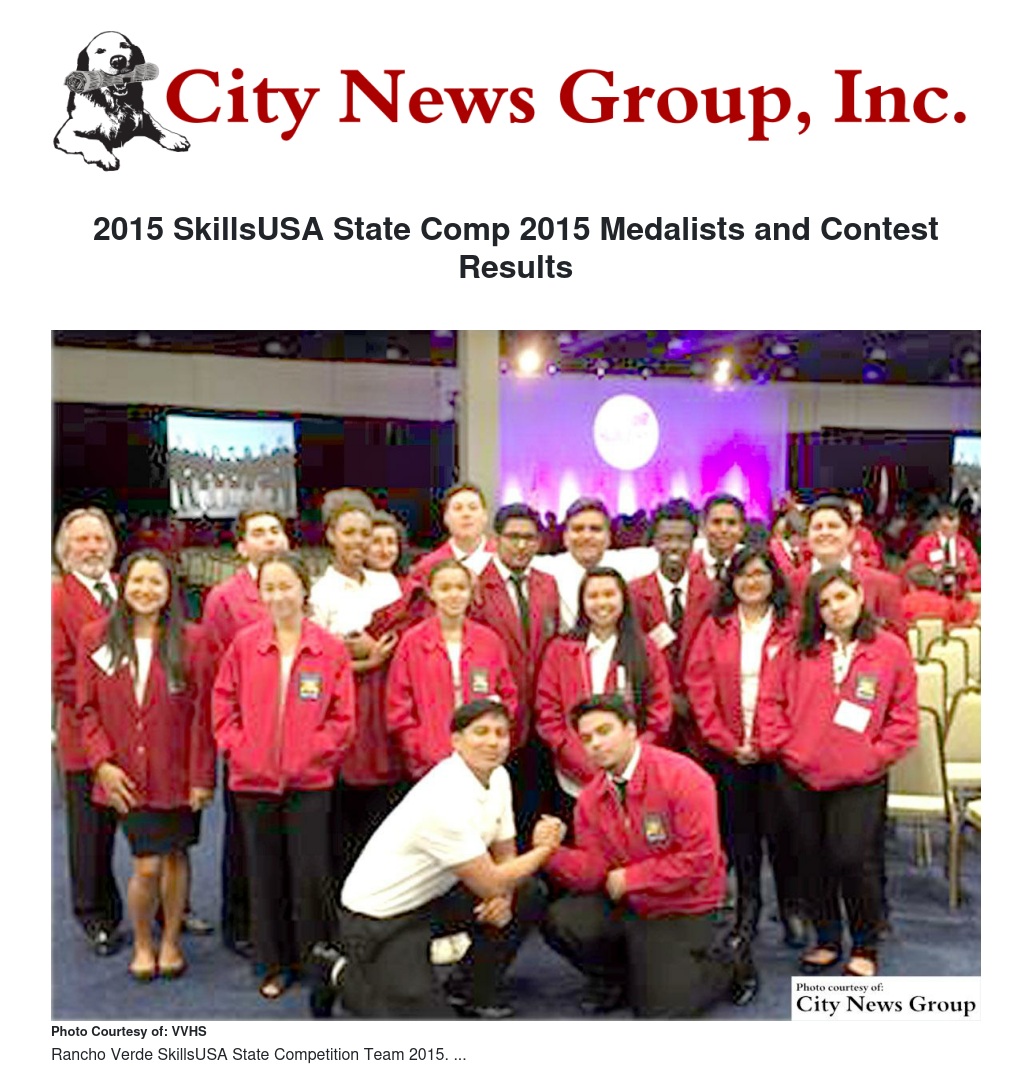 After competing at the SkillsUSA State Leadership and Skills Conference amongst several thousand competitors from every county in California, here are the results: John Dominguez, 2nd Place & $100 prize, State Design Contest 2015; Nicco San Antonio and Rogelio Roca, State Silver Medal, Occupational Health and Safety, Multiple; James Guerrero, State Bronze Medal, Practical Nursing.