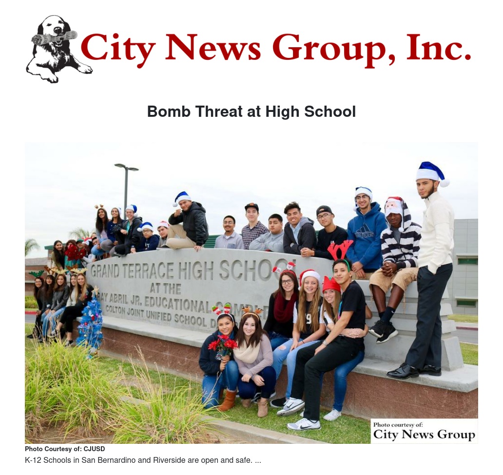 All students on campus were evacuated to the athletic fields for safety. The San Bernardino County Sheriff's Department conducted a thorough search of the campus and did not find a bomb. The Sheriffs office declared an all clear after their on campus investigating.