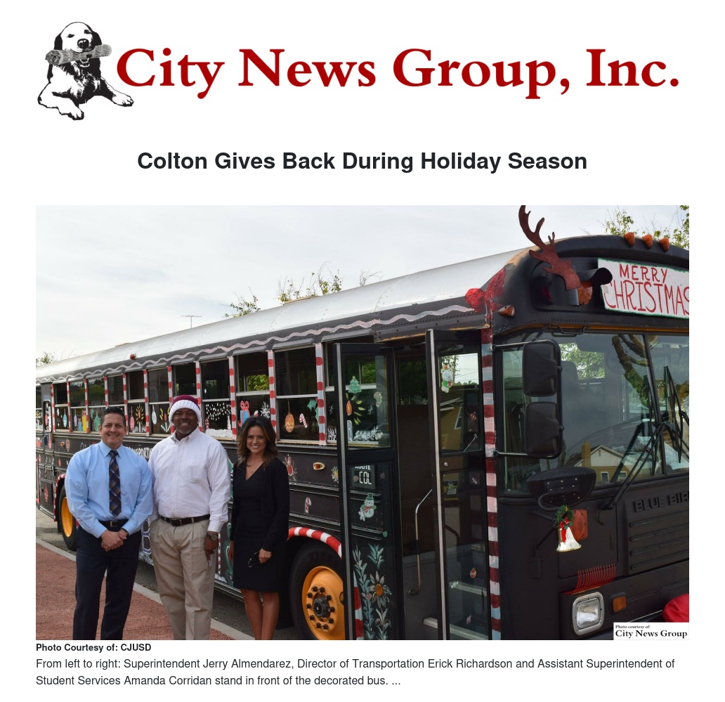 CJUSD Transportation Director Erick Richardson came up with the idea for the holiday bus. It follows in the tradition of the Kindness Bus, which rolled through the Colton Joint Unified School District during the month of October to bring positivity to schools and neighborhoods.
