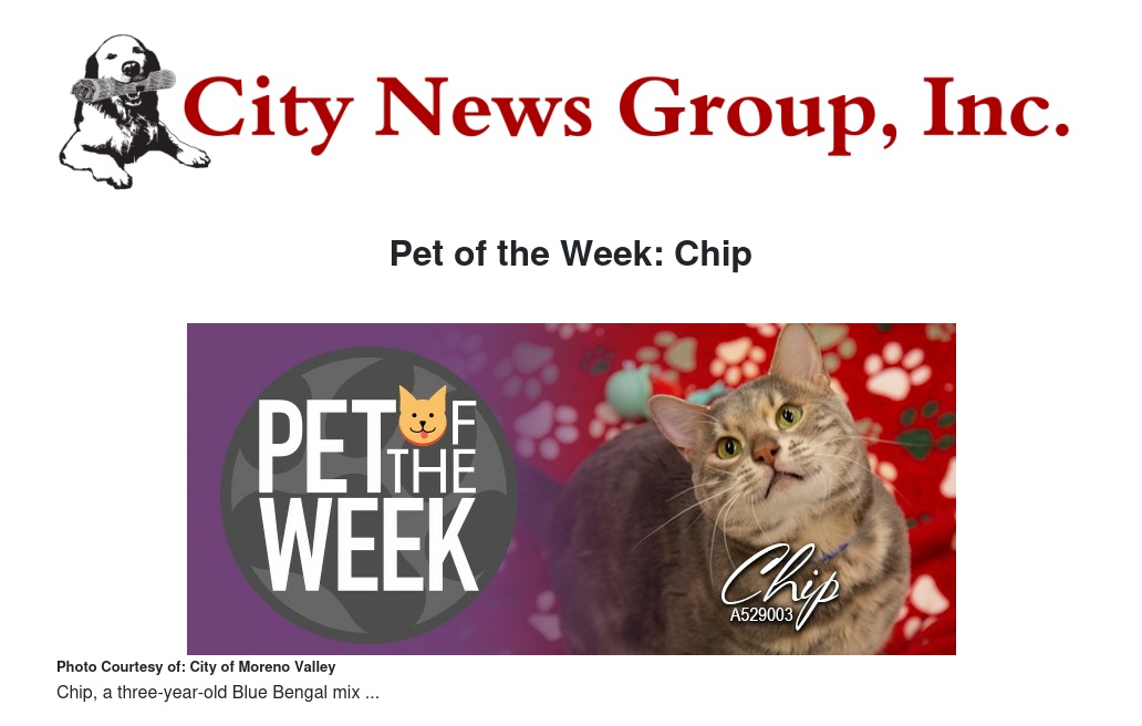Our Pet of the Week is Chip, a three-year-old Blue Bengal mix. Chip gets his name from the unique patterns in his fur. He's a fun feline who loves a good scratch on the back of his neck. Chip's sweet nature and mild temperament would be a purr-fect fit for any Moreno Valley family!