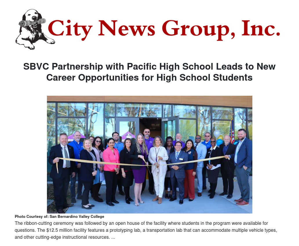 Pacific High School (PHS), in partnership with SBVC, hosted the community for a ribbon-cutting and open house ceremony for its new Transportation & Advanced Technology Center, co-located on its campus, on February 9, 2023. The 20,060-sq. ft. building will serve PHS students who are dually enrolled at SBVC and is the first of its kind in California.