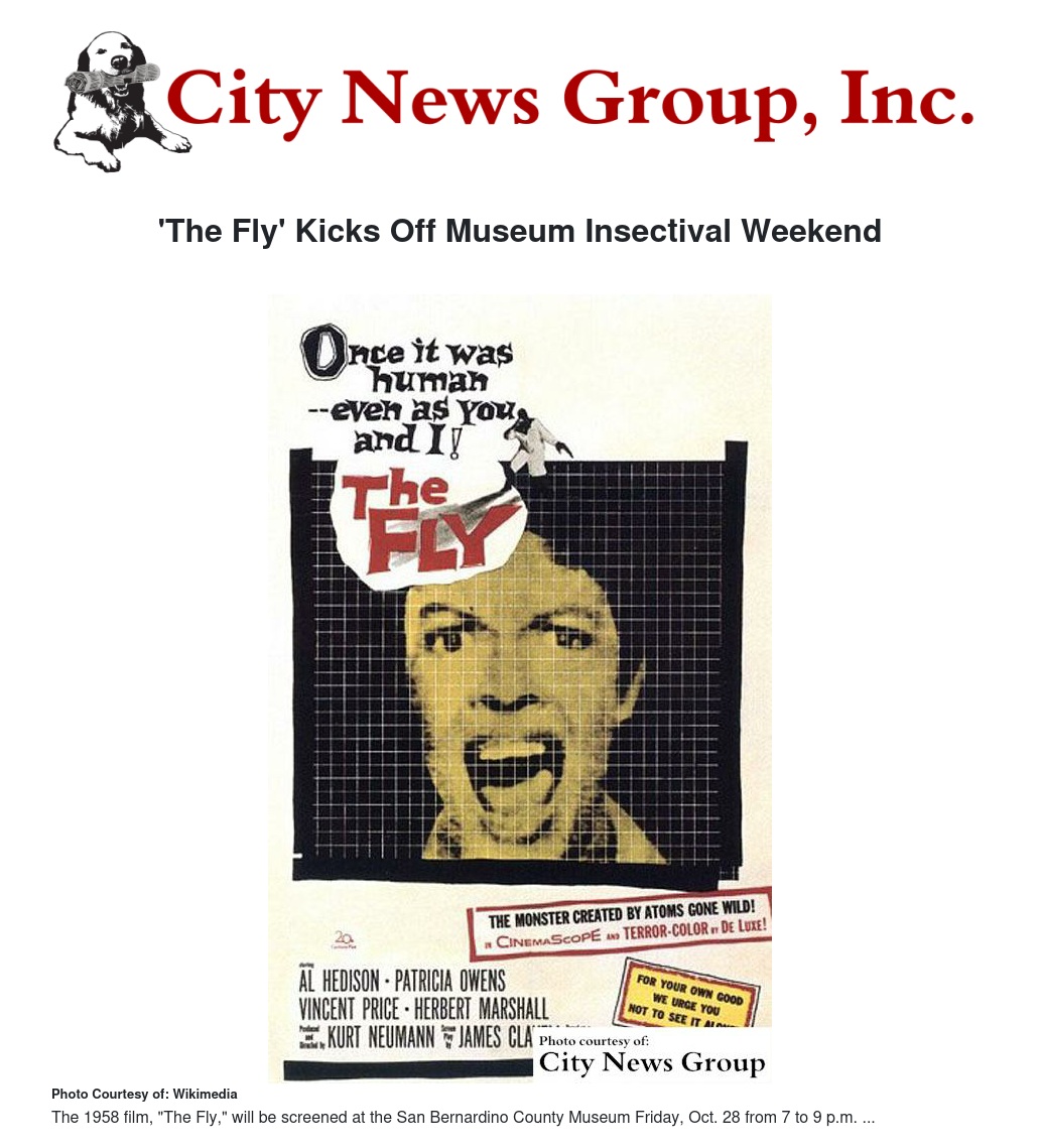 SAN BERNARDINO>> Back in 1958, unsuspecting people watching "The Fly" in a dark movie theater got scared out of their wits. Now, the Inland Empire community is invited to relive the terror when the San Bernardino County Museum Association screens the original "The Fly" on Friday, Oct. 28 from 7 to 9 p.m.