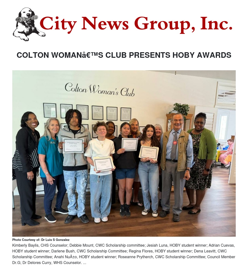 At the recent business meeting last week, the Colton Woman’s Club presented four “HOBY Awards” (Hugh O’Brien Youth), to local high school sophomores, Adrian Cuevas, Regina Flores, Jesiah Luna, and Anahi Nuño.