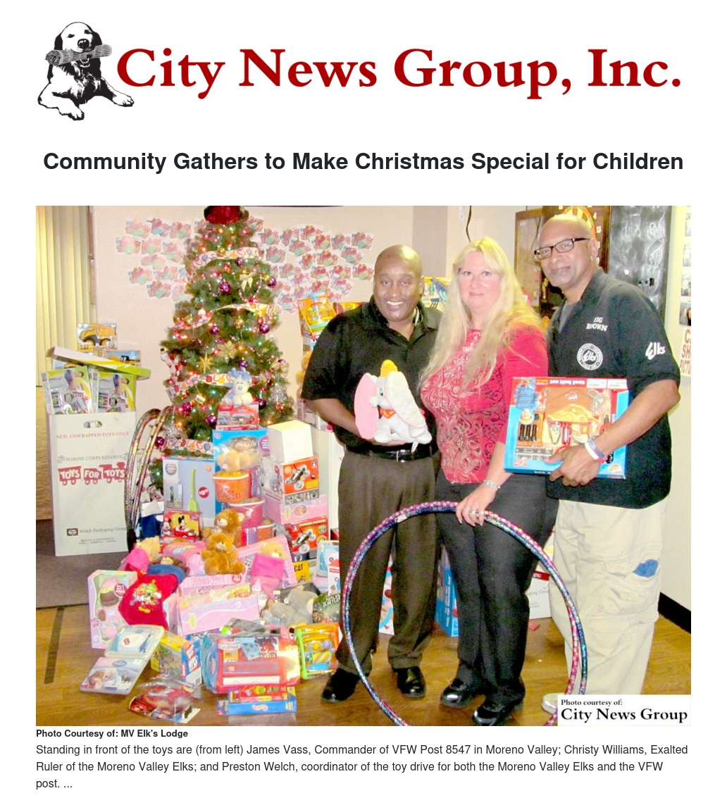 Moreno Valley Elks Lodge No. 2697 and VFW Post 8547 of Moreno Valley and Ysmael R. Villegas Memorial Post 184 in Riverside teamed up to make this Christmas a special time for less-fortunate children. The two Moreno Valley groups collected toys for the Toys for Tots toy drive and VFW Post 184, who contributed $250 to donate to Toys for Tots.