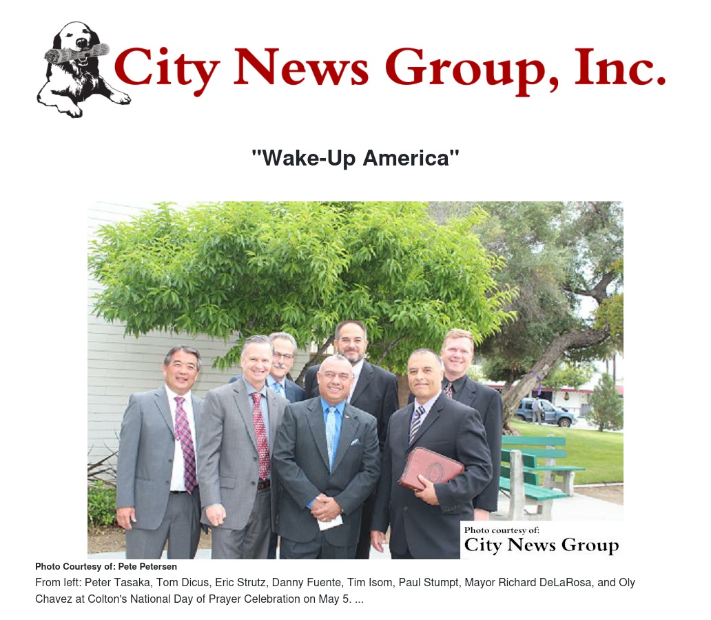 Colton community members also joined in to observe the national day of prayer at noon on Thursday, May 5. On the lawn under our flag at Colton City Hall, Colton High School Principal Pete Tasaka opened our National Day of Prayer by welcoming the group and introducing Dr. “G” (Louis Gonzales), educator and city council member to lead in the flag salute and a musical tribute on the trumpet.
