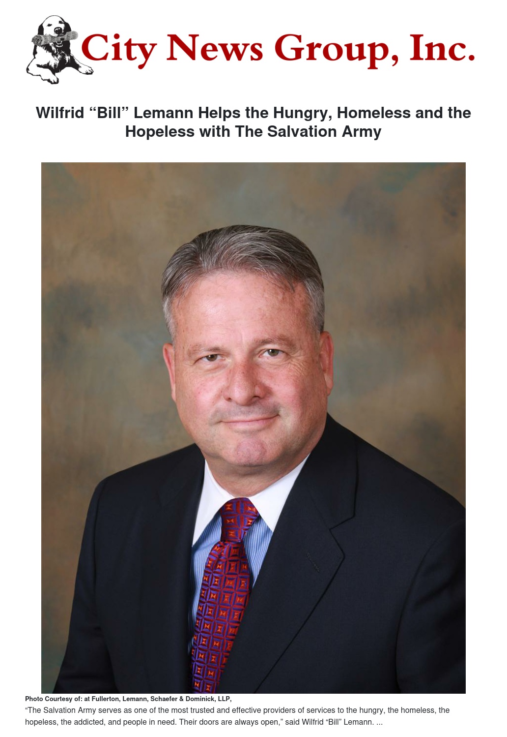 REDLANDS, CALIF.— Local attorney Wilfrid “Bill” Lemann, partner at Fullerton, Lemann, Schaefer & Dominick, LLP, is the Red Kettle Kickoff master of ceremonies for 2023. The annual start of the bell-ringing season for The Salvation Army is Wednesday, November 15th, at 5:30 p.m., at the Bear Springs Hotel Events Center, 27923 Highland Ave., Highland, CA 92346.