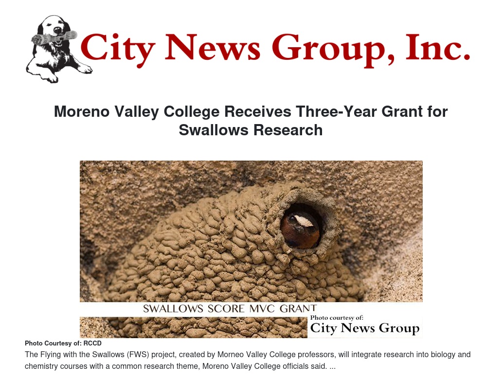 Moreno Valley College (MVC) has been awarded a three-year grant for $249,999 from the National Science Foundation (NSF), allowing for further study of the swallows, which make Moreno Valley College home each spring. The grant was won for its merit in an open category, competing against other universities throughout the nation for the funds, said Richard Keeler, dean of Grants for Riverside Community College District.