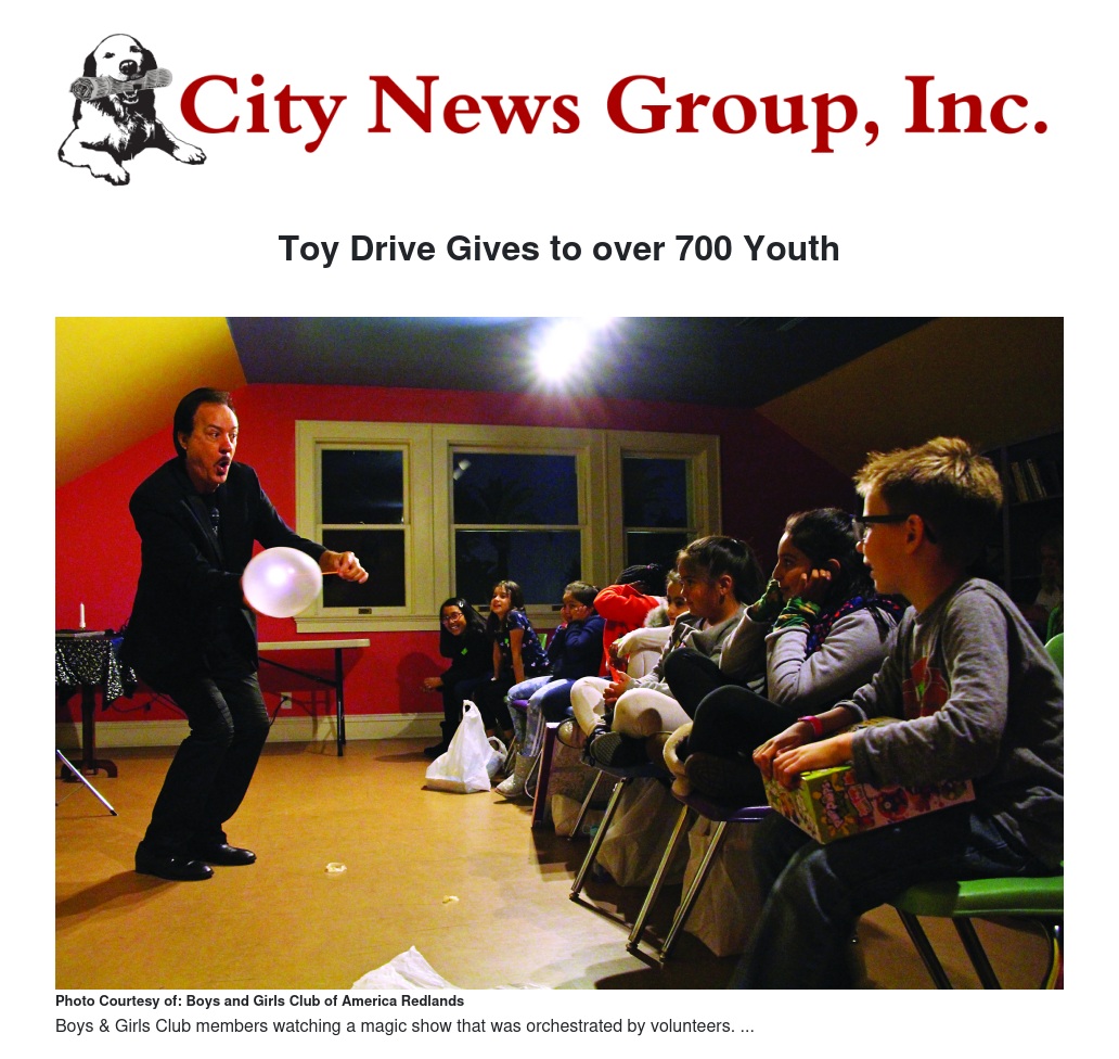 Kids from the eight Inland Empire communities where the Club offers programs were bused to the mansion for the event, which was held both inside and outside. Club members chose a toy, heard a story from Santa and Mrs. Claus, did crafts, watched a magic show, sang holiday songs with Redlands Community Music Association volunteers, played games, and ate pizza.