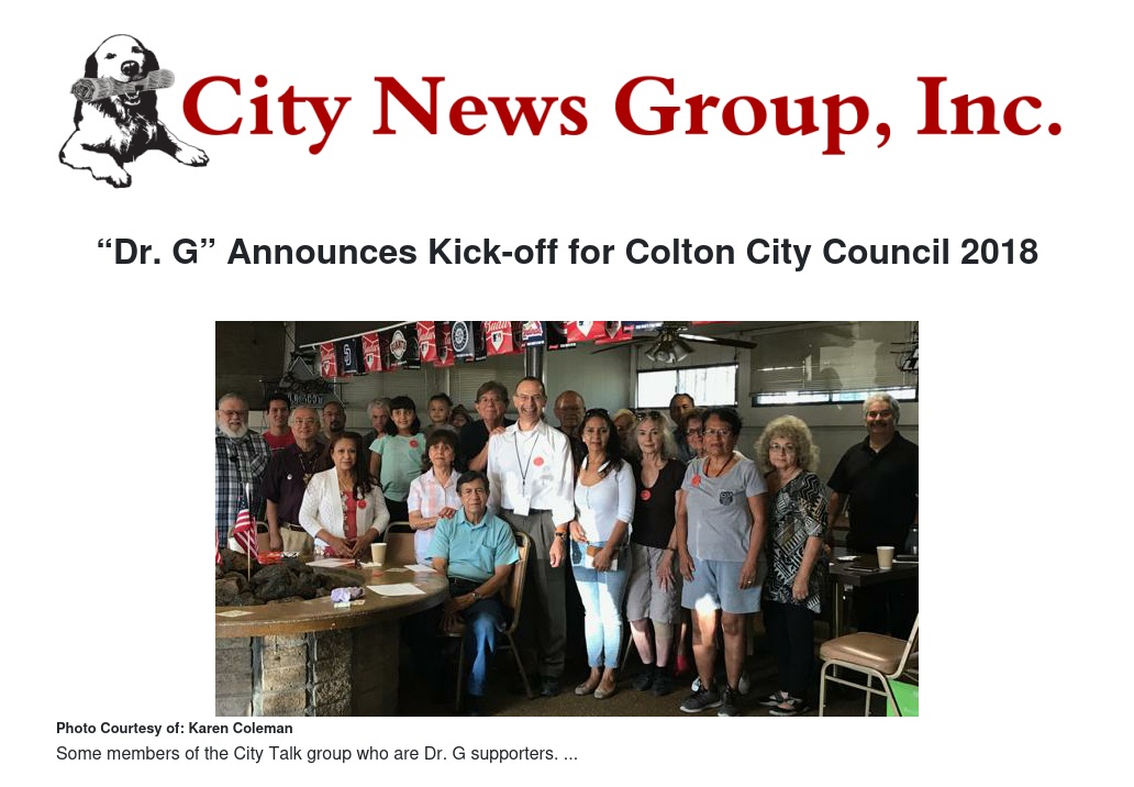 COLTON>> Last Saturday, July 15, during the regular meeting of the popular “City Talk” neighborhood gatherings, Council Member Dr. G (Dr. Luis S Gonzalez) announced the official beginning of his campaign for Colton City Council – District 4, for the next local election in November 2018.