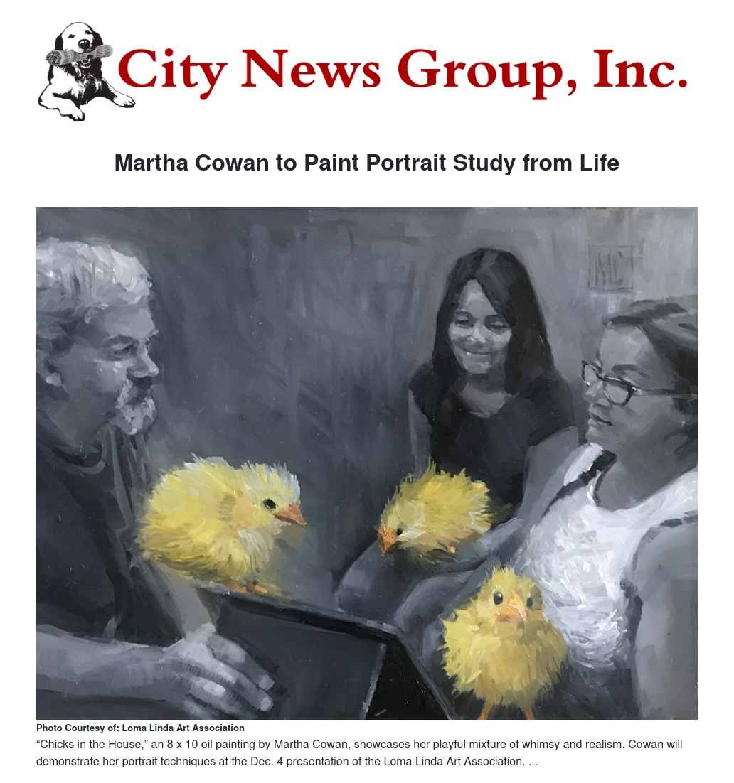 Noted Southern California artist Martha Cowan will paint a portrait study from life using the winner of a raffle drawing as her model at the Dec. 4, 2022, meeting of the Loma Linda Art Association. The presentation will also feature the reveal of three new leaders for the organization and the launch of the 2023 membership drive. The event will be held from 2 to 4 p.m. in the conference room of the Councilors Student Pavilion at 24945 Mound Street in Loma Linda.