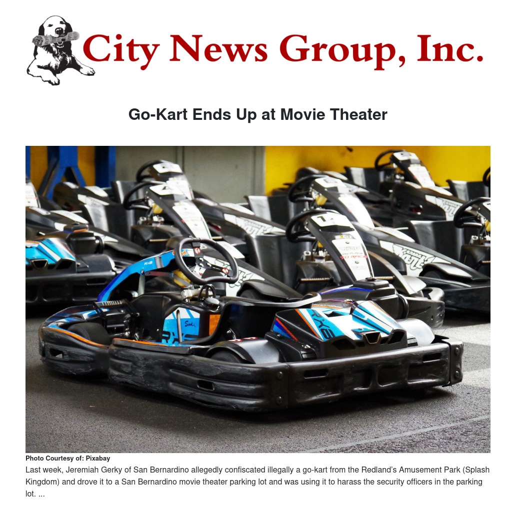 SAN BERNARDINO>> On Sunday August 6, Jeremiah Gerky of San Bernardino allegedly confiscated illegally a go-kart from the Redlands Amusement Park Splash Kingdom and drove it to a San Bernardino movie theater parking lot where he was using it to harass the security officers in the parking lot. The movie theater at E and Fourth streets was where the police apprehended the suspect and arrested him on suspicion of grand theft and then proceeded to take possession of the go-kart, which was later returned to Splash Kingdom. The powder blue go-cart identified by the number 19 on the hood was stolen from a fenced in area at the Park on Sunday evening. The movie theater is approximately 6 miles from the scene of the crime, and Gerky took 2 hours driving time to get there.