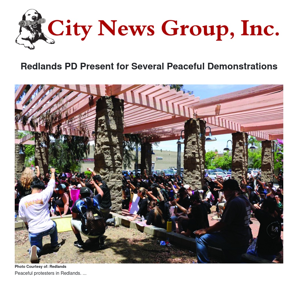 According to Catren, on Sunday May 31 ,2020, the Redlands Police Department, along with partners in the Redlands Fire Department, were present for several peaceful demonstrations that were held in various parts of the City, including Citrus Plaza and Historic Downtown Redlands. The goal was to both protect public safety and property, but also to ensure that the constitutional right to free speech and assembly was also protected. The officers met with the organizers of the protests ahead of time and came to a mutual agreement on these principles. Each of the demonstrations was conducted peacefully.