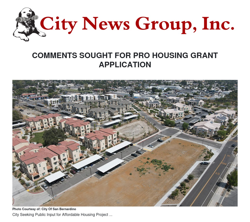 The City of San Bernardino is asking residents and interested parties to provide comments as part of its application to the Department of Housing and Urban Development (HUD) for its grant application for Arrowhead Grove, an affordable housing project to be located near the intersection of Waterman Avenue and Baseline Street.