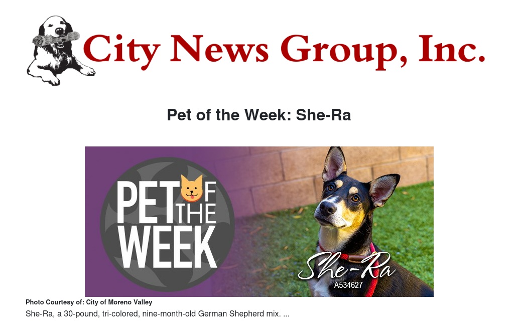 If you would like to make She-Ra or any pet from the Moreno Valley Animal Shelter part of your family, please contact the Moreno Valley Animal Shelter at 951.413.3790 or visit www.moval.org/pets