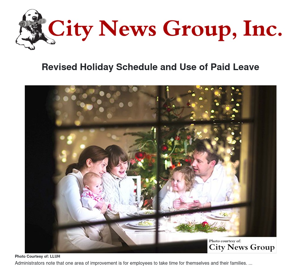 In August, an administrative message was sent encouraging all employees in administrative and support departments to use a minimum of 15 paid leave days by the end of the year. This would include the holidays that remain in 2015 and New Year’s 2016. This applies to employees of LLU Medical Center, Children’s Hospital, Behavioral Medicine Center and Shared Services.