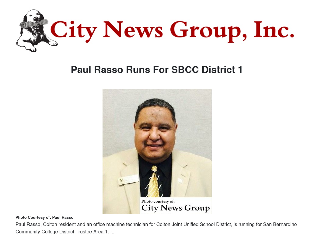 By running for San Bernardino Community College District Trustee Area 1, Rasso said he decided to run in order to open doors for student success and career readiness by working to bridge the gaps between colleges and region employers to ensure every student is receiving the best possible support stating at enrollment and ending with the highest quality of education for career readiness.