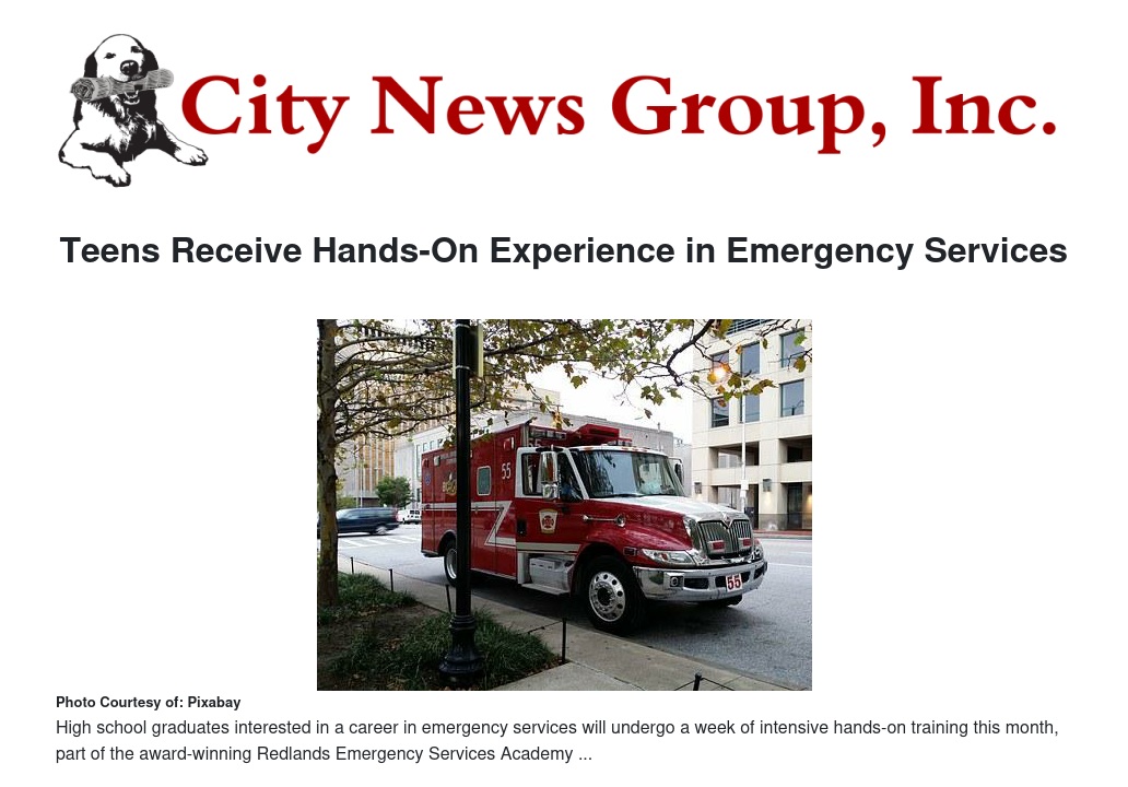 Redlands High school graduates who are interested in a career in emergency services will undergo a week of intensive hands-on training this month, part of the award-winning Redlands Emergency Services Academy.  Each year, some two dozen local teens with an interest in a public safety career attend the annual Redlands Emergency Services Academy.  The participants share temporary quarters for one week on the campus of the University of Redlands, are exposed to hands-on training exercises in fire and police operations, and are introduced to state of the art simulators.  This program stresses the importance of a well-rounded education, as well as the value of an extended education to each of the teens in attendance.