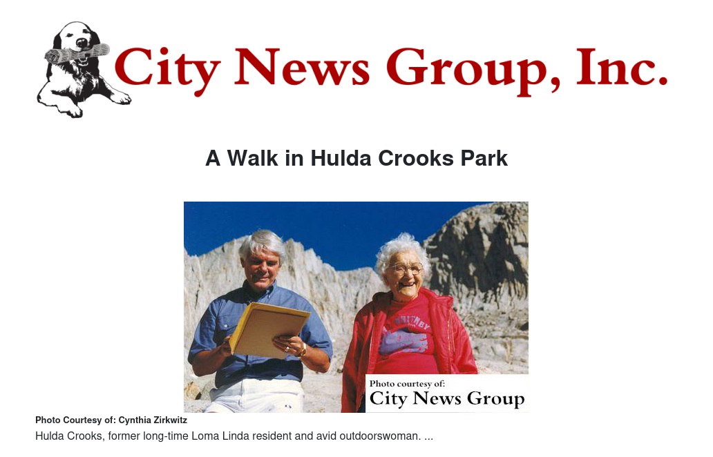 Hulda Crooks Park got its name from a long-time Loma Linda resident and avid outdoorswoman, Hulda Hoehn Crooks, born May 19, 1896. She was an American mountaineer, and between the ages of 65 and 91, she scaled the 14,505 ft. trail to the top of Mt. Whitney, the highest summit in the contiguous United States, 23 times. To honor the feat, Congress renamed Day Needle, one of the peaks in the area of Mt. Whitney, Crooks Peak in 1990.
