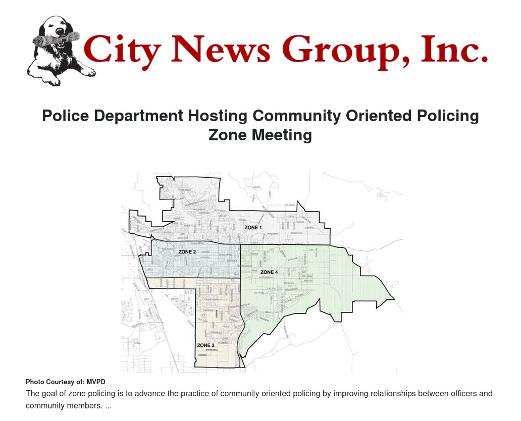 Moreno Valley Police Department officers are hosting a Community Oriented Policing Zone meeting on Wednesday, Aug. 27 to provide an opportunity for all community members to meet with police officers to discuss community issues and build relationships.