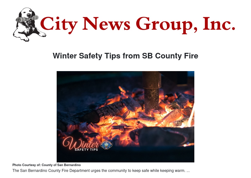 Tuesday, December 21 may be the first day of winter, but a little extra precaution goes a long way to avoid a tragic incident; especially when additional heating sources such as fireplaces or space heaters are involved. Using these heating sources safely can greatly decrease the chance of having a preventable home fire. The San Bernardino County Fire Department urges the community to keep safe while keeping warm. The tips below are some cold weather safety precautions to help everyone stay warm in the safest way possible.