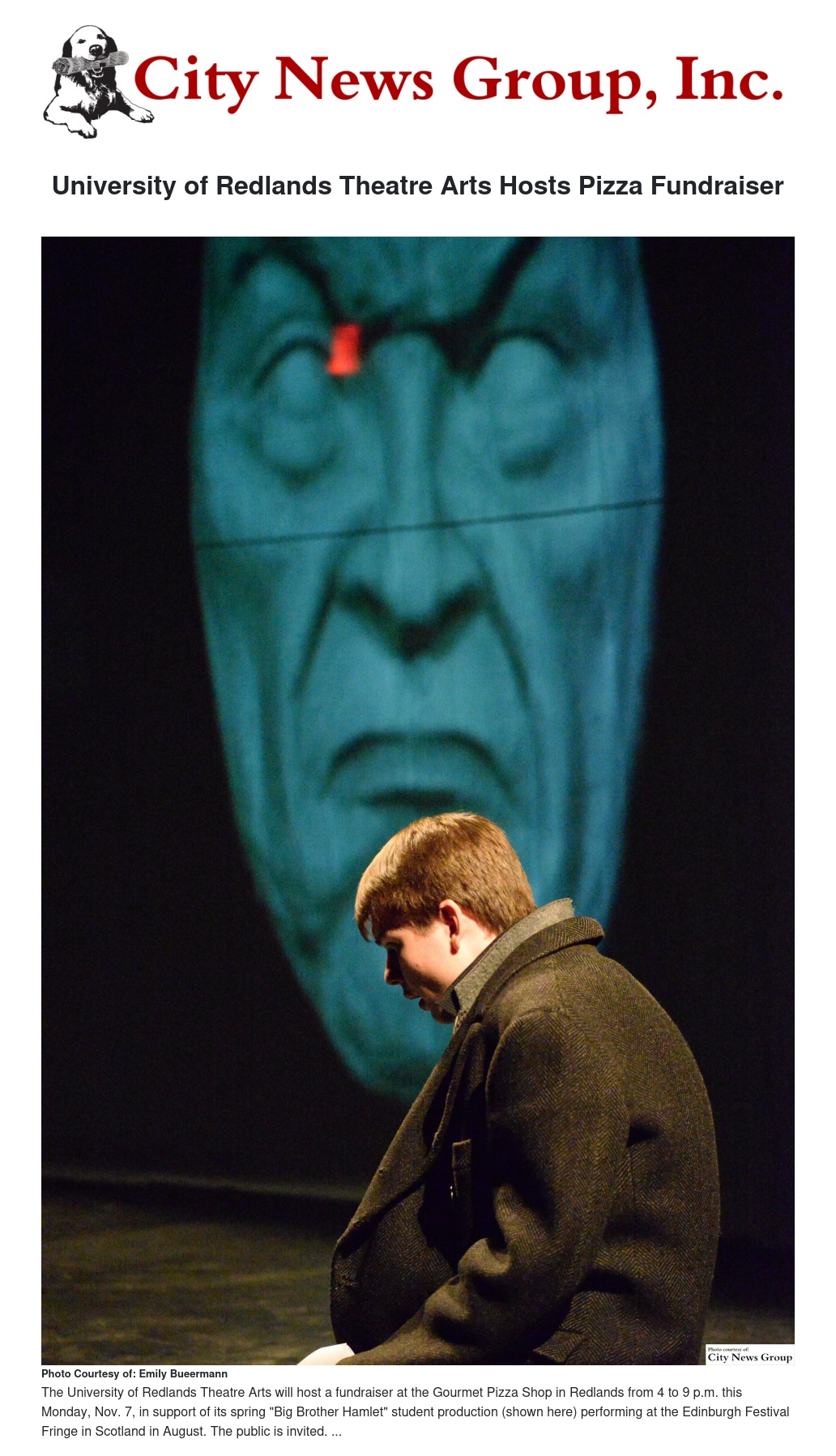REDLANDS>> The University of Redlands Theatre Arts Department will host a fundraiser from 4 to 9 p.m. Mon., Nov. 7 at the Gourmet Pizza Shoppe, 120 E. State St. The event is to support U of R’s “Big Brother Hamlet” spring student production performing at the Edinburgh Festival Fringe in Scotland this August.