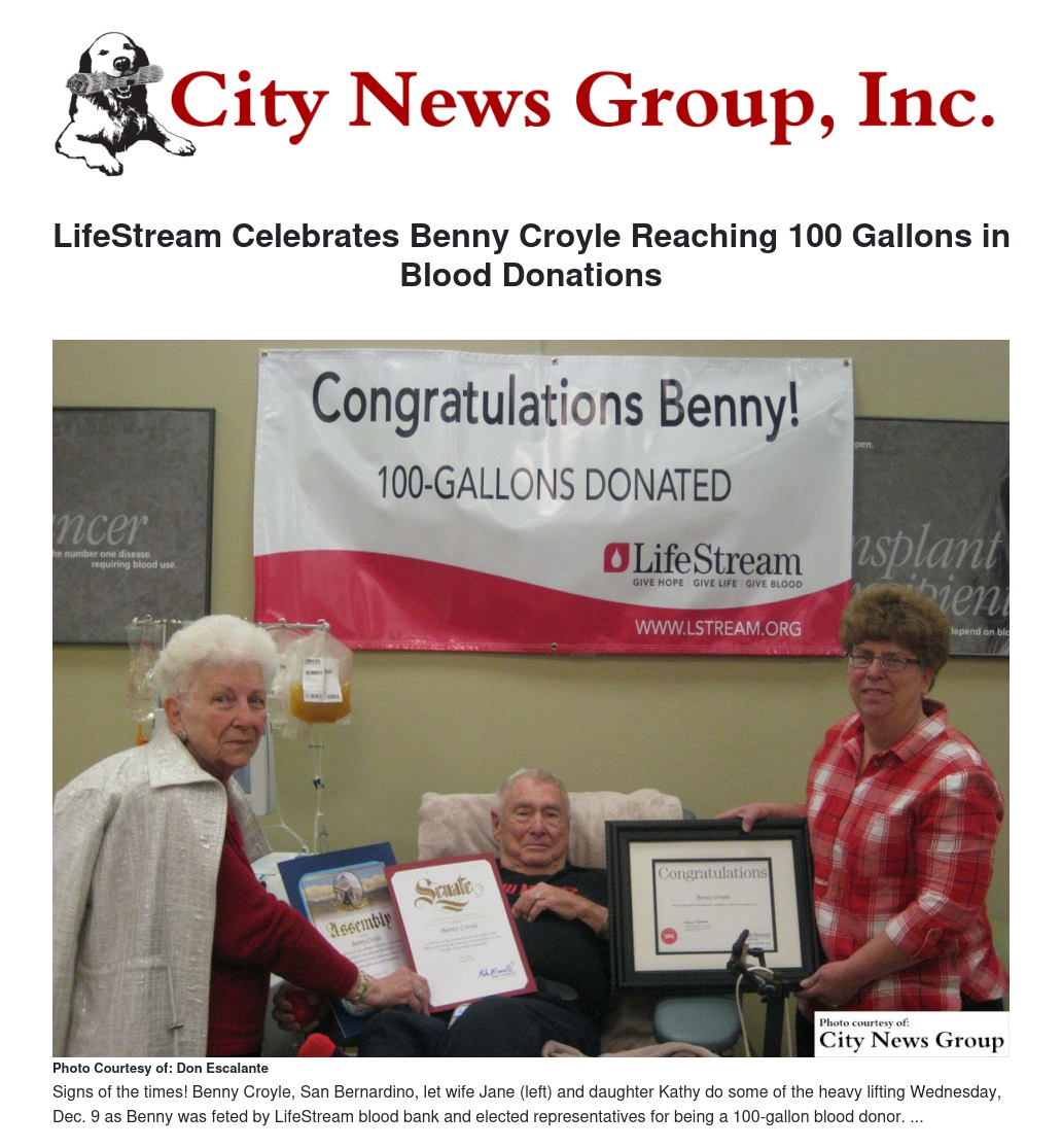 Actually, if Croyle had had his way years ago, he would have reached the milestone sooner. He wanted to give blood when serving in the US Air Force, but was prohibited from doing so since he flew. He was transferred to Norton AFB in 1969 and has lived in San Bernardino ever since.