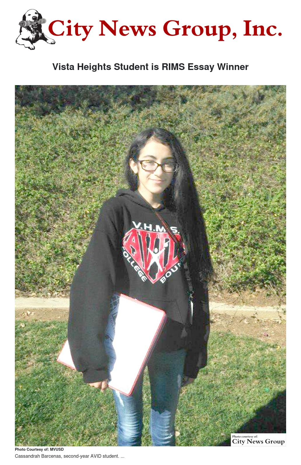 Each year the Vista Heights Middle School AVID program enters the RIMS (Riverside, Inyo, Mono, San Bernardino Counties) Write-off Essay Contest. This year, Cassandrah Barcenas, a second-year AVID student, was selected as the seventh-grade RIMS Regional Winner!