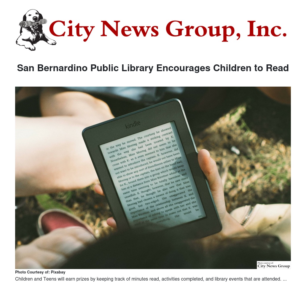 SAN BERNARDINO>> The San Bernardino Public Library will hold their annual summer reading program from May 22 through July 22, 2017. This year’s summer reading theme is “Reading by Design”. Children, teens, and adults are all able to participate to win prizes.