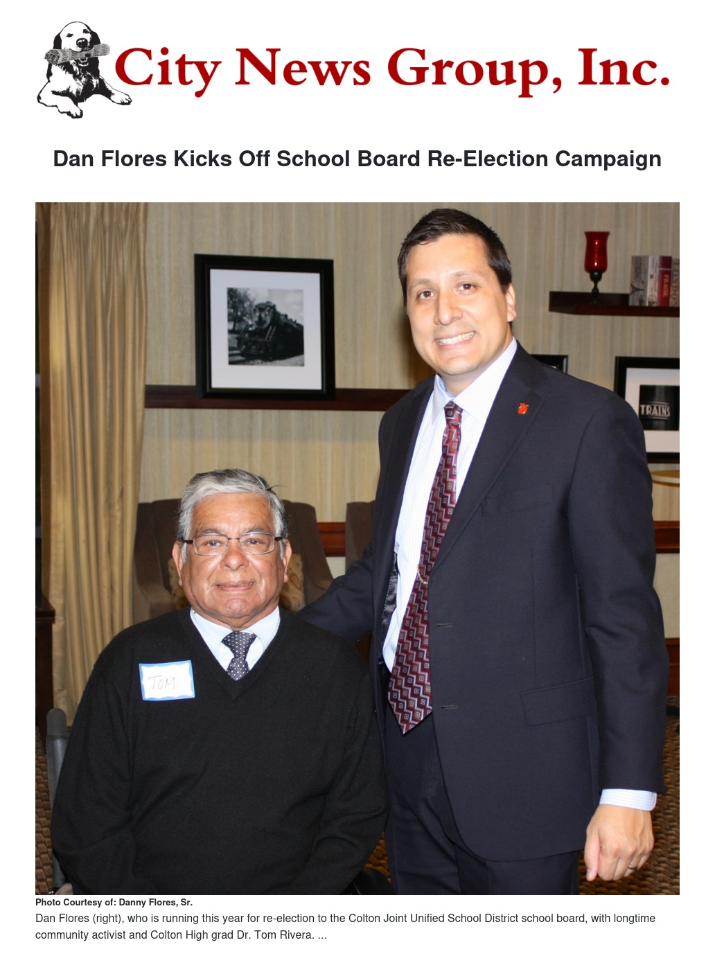 Colton Joint Unified School District (CJUSD) trustee Dan Flores kicked off his re-election campaign Thursday evening, Feb. 27 in Colton, at the Hampton Inn Suites in the Dominguez Plaza.