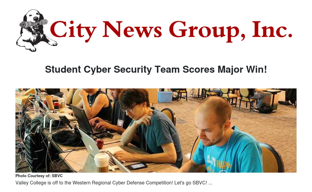 The Cyber Security student team from San Bernardino Valley College (SBVC) vanquished teams from other community colleges, as well as four-year colleges, in order to advance to the Western Regional Cyber Defense Competition.