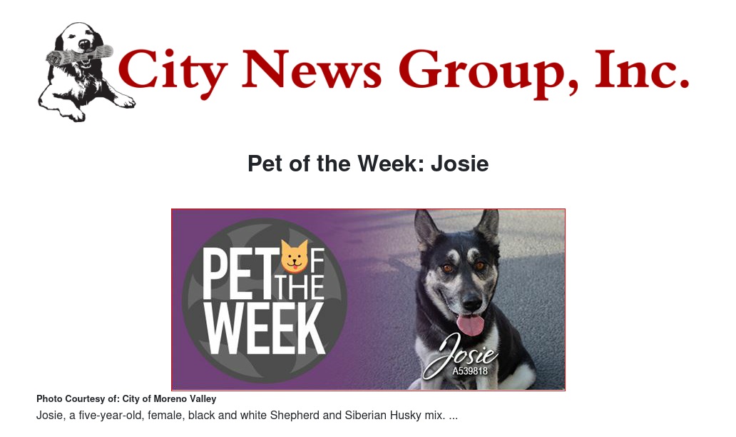 If you would like to make Josie or any pet from the Moreno Valley Animal Shelter part of your family, please contact the Moreno Valley Animal Shelter at 951.413.3790 or visit www.moval.org/pets. |