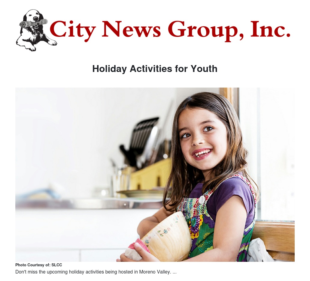 The Moreno Valley Parks and Community Services Department is hosting several special holiday activities. The festivities begin on Monday, Dec. 8, with Santa Live. From 5:30 to 7 p.m., local children may speak to Santa Claus on the local channel MVTV-3 by telephoning him at 951-413-3059.
