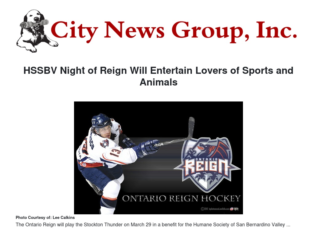 A fundraiser for The Humane Society of San Bernardino Valley will be held on March 29 at the Ontario Reign hockey game, sponsored by FrontLine Plus.