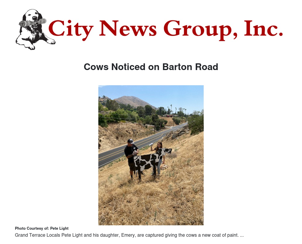 Over the years, the cows have adorned the City of Grand Terrace and the locals have been enamored with them. So much so that when Pete Light, and his daughter Emery, passed by every day they could not accept letting them wither away.  As the paint grew fader they knew something had to be done. So Pete and Emery offered to help Rivera repaint the cows at no expense to her.