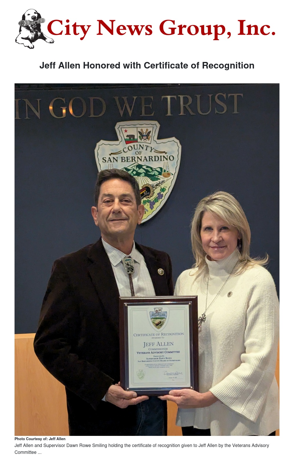 Jeff Allen Honored with Certificate of Recognition by Ruby Stephenson - City News Group, Inc.