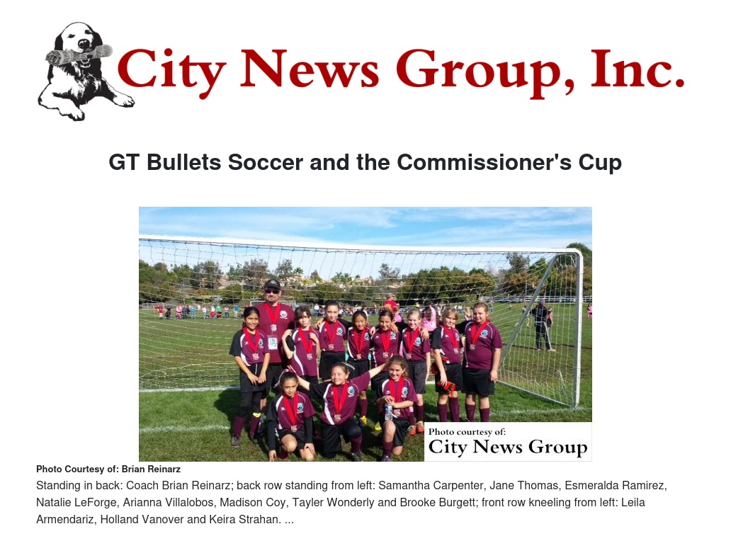 On Dec. 13 and 14, the GT Bullets of the Grand Terrace Community Soccer Club Girls’ Under 10 Division traveled to Temecula to participate in the 2014 Cal South District 5 Commissioner’s Cup tournament.