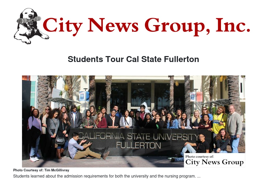 Thirty-three Health Careers Academy students recently attended a Cal State Fullerton campus tour and a School of Nursing simulation lab presentation.