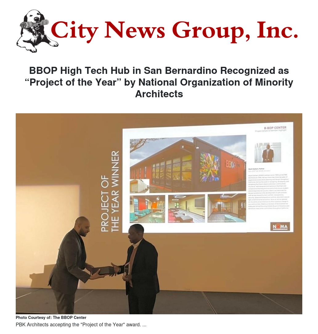 The Black and Brown Opportunities for Profit (BBOP) Center has been recognized with the esteemed "Project of the Year" award for design excellence by the National Organization of Minority Architects (NOMA), Southern California Chapter. Receiving the “Project of the Year” award from NOMA is a testament to the BBOP Center’s commitment to excellence in design and its significant impact on the community. This recognition further solidifies the B-BOP’s position, which strongly believes that spaces and places are always predicated on quality structures that emanate the soul of a community and give life to the inhabitants of the spaces.