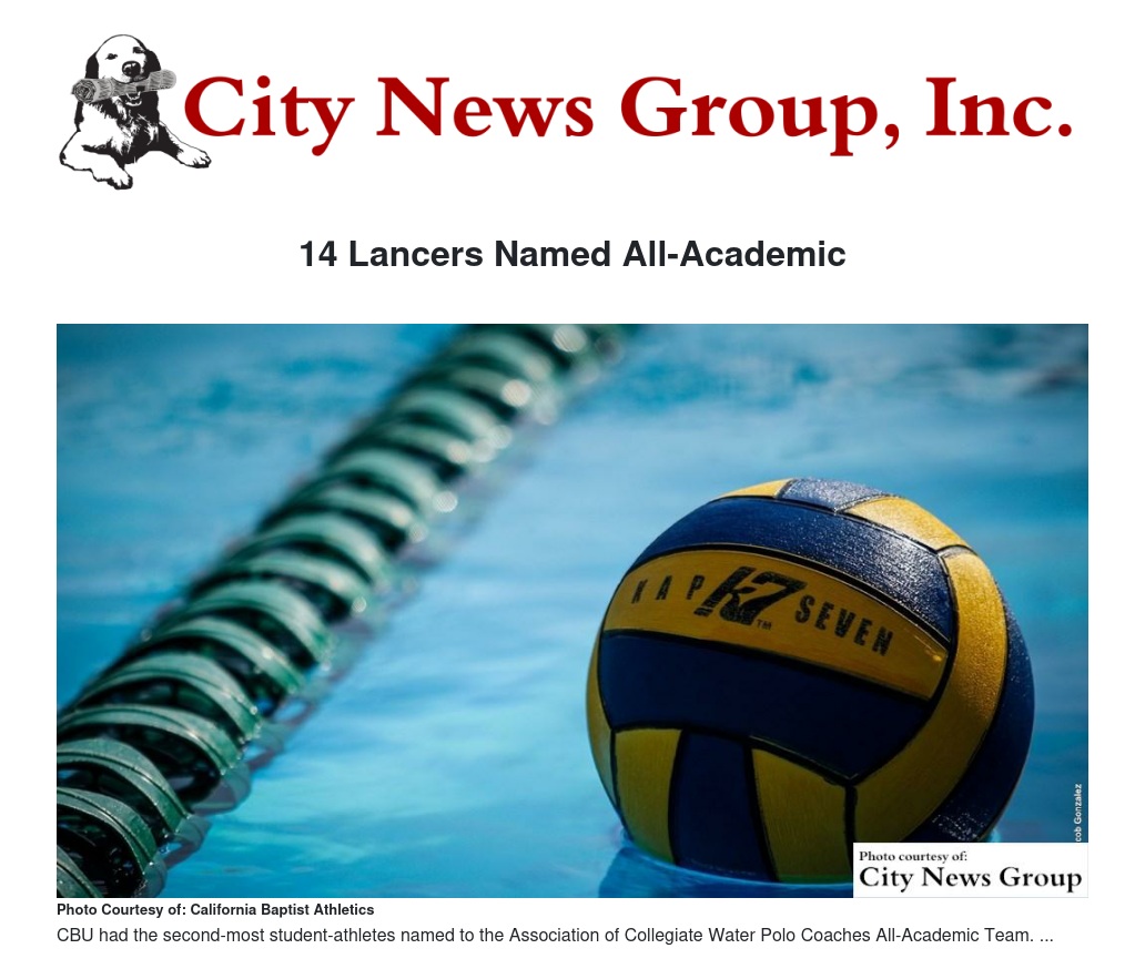 MORENO VALLEY >> An outstanding 14 California Baptist University women's water polo players were named to the Association of Collegiate Water Polo Coaches All-Academic Team. It marks the most ACWPA All-Academic honorees in program history, previously held at 12 in 2007.
