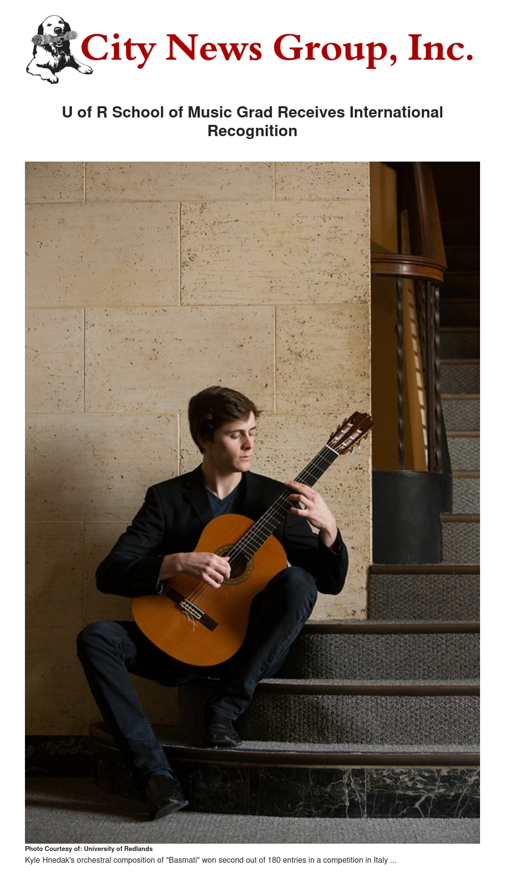 Recent Redlands graduate, Kyle Hnedak, has won second prize for his orchestral composition “Basmati” in the 2014 edition of Concorso 2 Agosto, a composition competition held in Bologna, Italy.